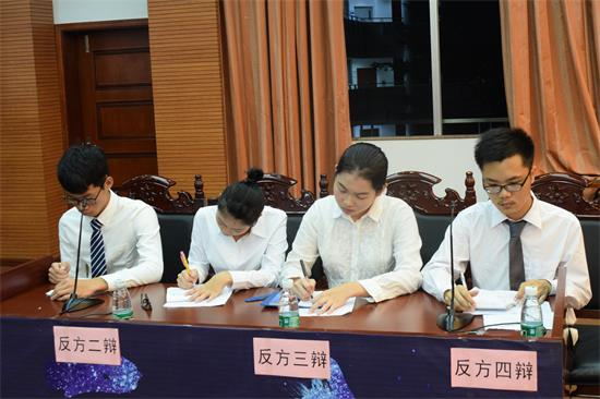 最激烈的莫过于自由辩论环节。在八分钟的有限时间里,正反双方你来我往,针锋相对。辩手们思维紧凑、口齿伶俐又落落大方。辩题思辨性强,双方辩手没有丝毫的懈怠,认真聆听对方的观点,做好记录,以期找出对方发言中的漏洞,加以辩驳,从而掌握比赛的主动权。辩手们积极交锋,各自从容应对,不断对己方观点进行深入阐释,同时也深化了在场观众对辩题的认识。