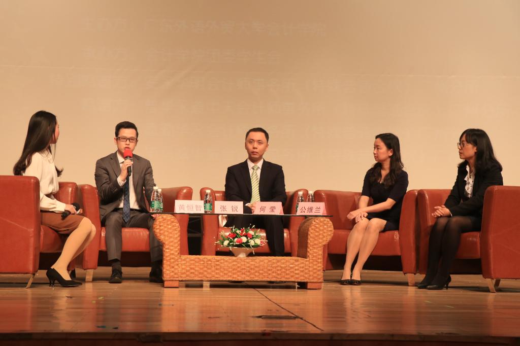 紧接着,主持人邀请四大会计师事务所嘉宾黄恒智先生、张锐先生、何莹女士以及公维兰女士上台,备受期待的“四大面对面论坛”随之展开。论坛之上,四位嘉宾可谓知无不言,财会行业热点信息、四大会计师事务所部门结构与职能、职业生涯发展方向以及应聘面试的求职干货等内容应有尽有。