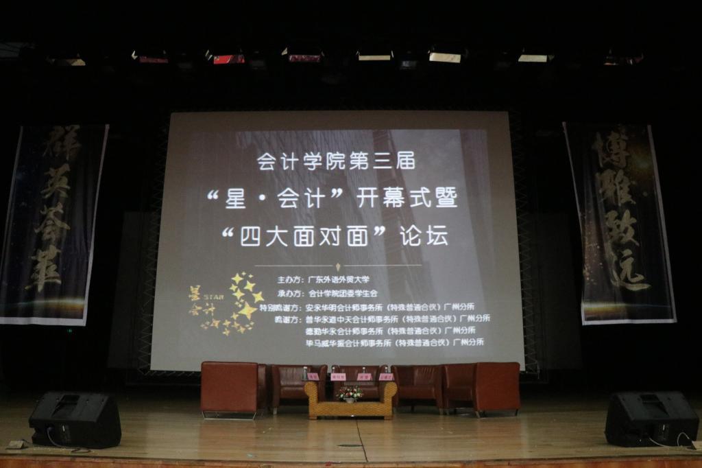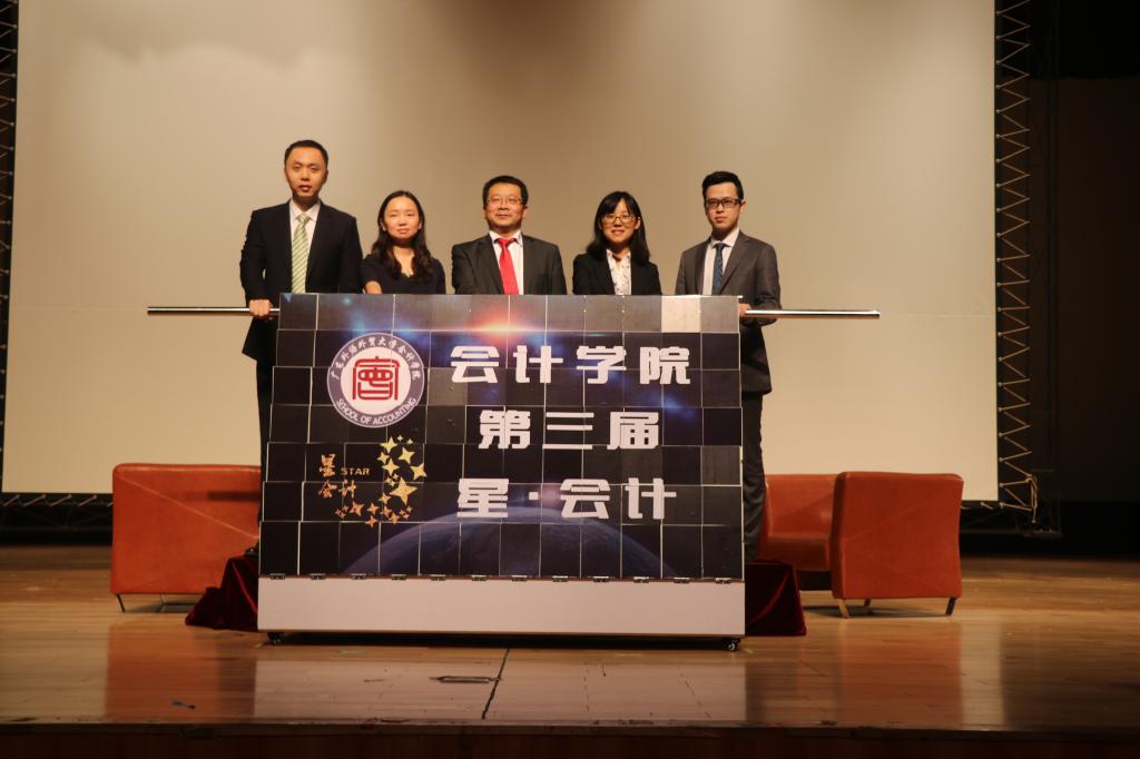 2017年3月23日星期四下午七时,beat365唯一官方网站第三届“星·会计”开幕式暨四大面对面论坛在南校区大会堂隆重举行。出席本次活动的有来自四大会计师事务所的嘉宾:安永华明会计师事务所广州分所审计部高级经理黄恒智先生,毕马威华振会计师事务所税务部合伙人何莹女士,普华永道中天会计师事务所企业并购咨询部总监张锐先生以及德勤华永会计师事务所审计部高级经理公维兰女士。此外,我校就业指导中心娄会东副主任;beat365唯一官方网站院长刘中华教授、beat365唯一官方网站党委书记孙家和教授、beat365唯一官方网站副院长蒋基路副教授、beat365唯一官方网站党委副书记黄晓梅老师以及来自商学院、金融学院、法学院以及新闻与传播学院的团委书记及beat365唯一官方网站学工办的老师出席了此次活动。