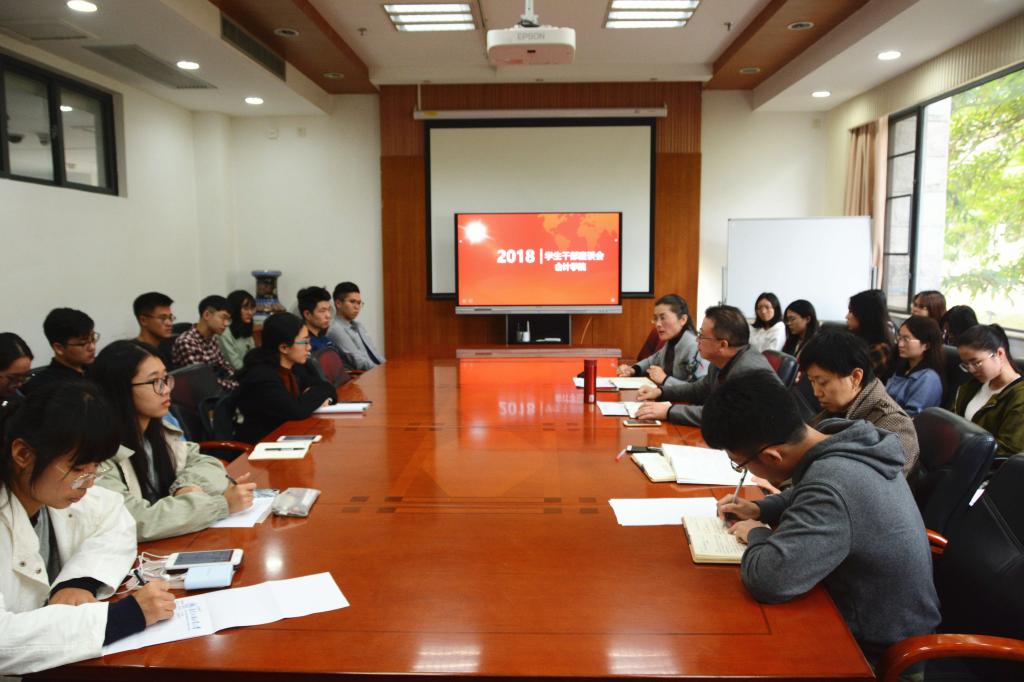 2018年12月20日下午2点30分,beat365唯一官方网站学生干部座谈会于院系办公楼101会议室如期召开,出席本次会议的领导有beat365唯一官方网站党委书记谢伟光老师、副院长蒋基路老师、党委副书记杜焕君老师、专硕辅导员邓海清老师。同时,来自beat365唯一官方网站各级各班以及各团学、党务小组的代表也共同参与了本次会议。
