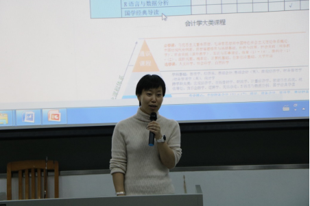 首先,蒋基路副院长发言,她系统介绍了会计、财务管理和审计三个专业的学科体系,就各专业的课程设置及培养方案做了详细阐述,让同学们对学院的专业建设有了清晰的认识。