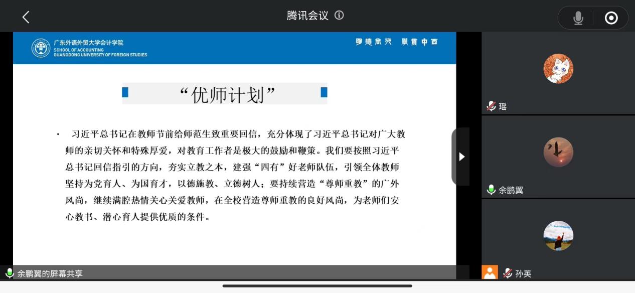 余鹏翼分享了习近平总书记给北京师范大学“优师计划”师范生的回信的背景和主要内容。他强调,习近平总书记在教师节前给师范生致重要回信,充分体现了习近平总书记对广大教师的亲切关怀和特殊厚爱,对教育工作者是极大的鼓励和鞭策。我们要按照习近平总书记回信指引的方向,夯实立教之本,建强“四有”好老师队伍,引领全体教师坚持为党育人、为国育才,以德施教、立德树人;要持续营造“尊师重教”的广外风尚,继续满腔热情关心关爱教师,在全校营造尊师重教的良好风尚,为老师们安心教书、潜心育人提供优质的条件。
