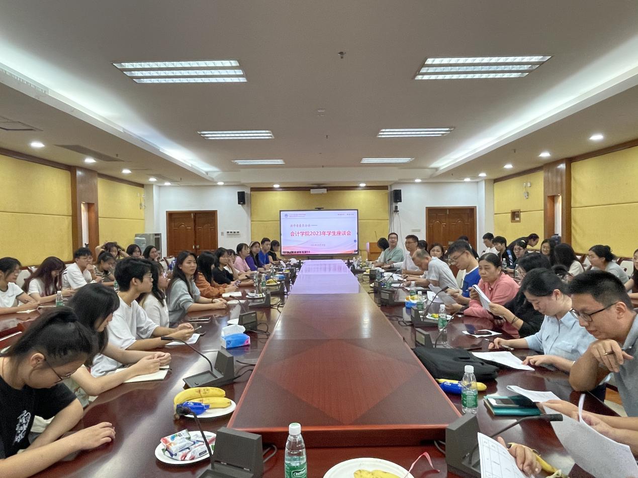接下来举行了学生座谈会,党委书记黎冬、党委副书记李海琳、副院长黄浩、龙文滨以及会计系主任曹瑜强、审计系主任钟子英、财务管理系主任许红梅、ACCA项目主任常亮以及CIMA项目主任苏力、国创项目主任孙黎、全体辅导员、教务办老师和各班级的学生代表出席了本次会议。