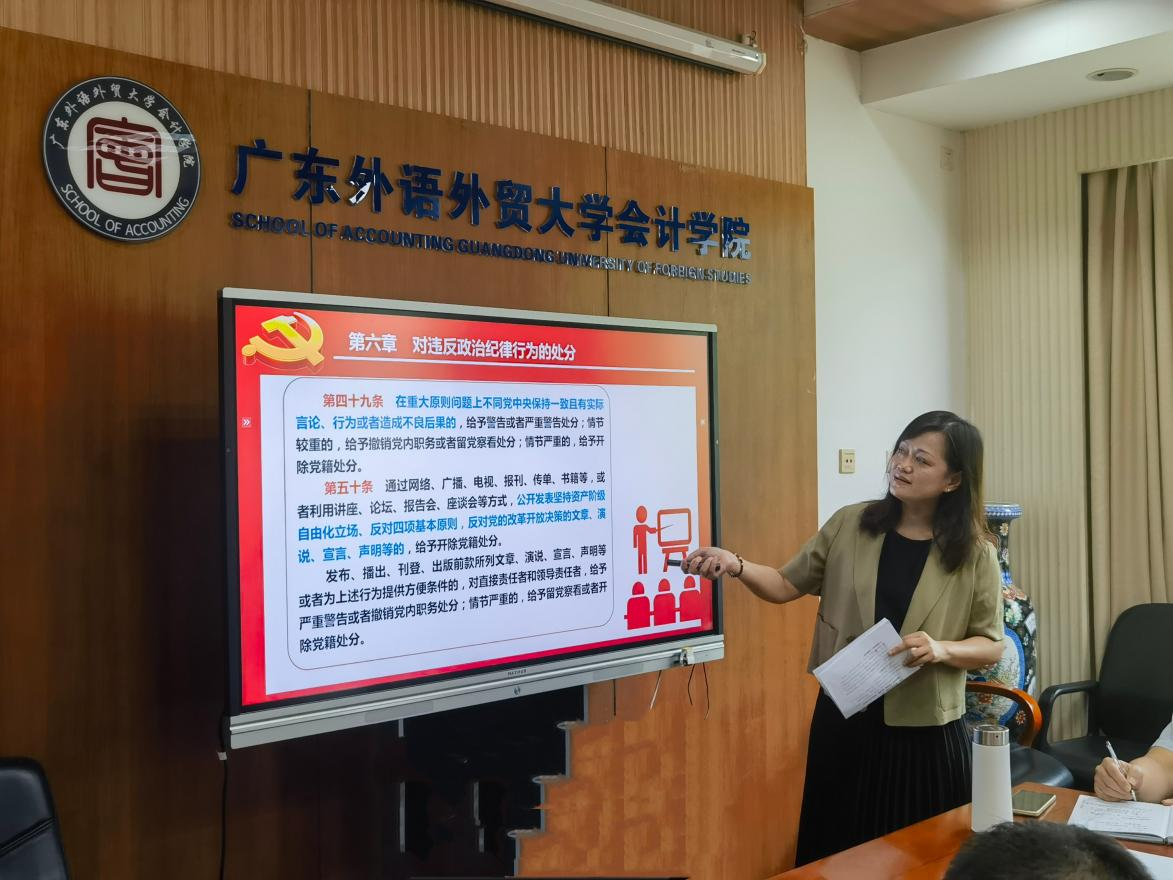 随后,结合典型案例,龙文滨领学了《条例》第二编第六章“对违反政治纪律行为的处分”的相关内容,一方面帮助与会党员对违反政治纪律的相关行为有了更加全面、准确的认识,另一方面对此类行为可能会受到的纪律处分的学习也再一次提醒全体党员远离此类行为,“恪守初心”。同时她还对其中与高校教师工作相关的条款规定,通过列举有关案例来加以说明,以鲜活的案例加深了各位党员同志对此类条款的认识。