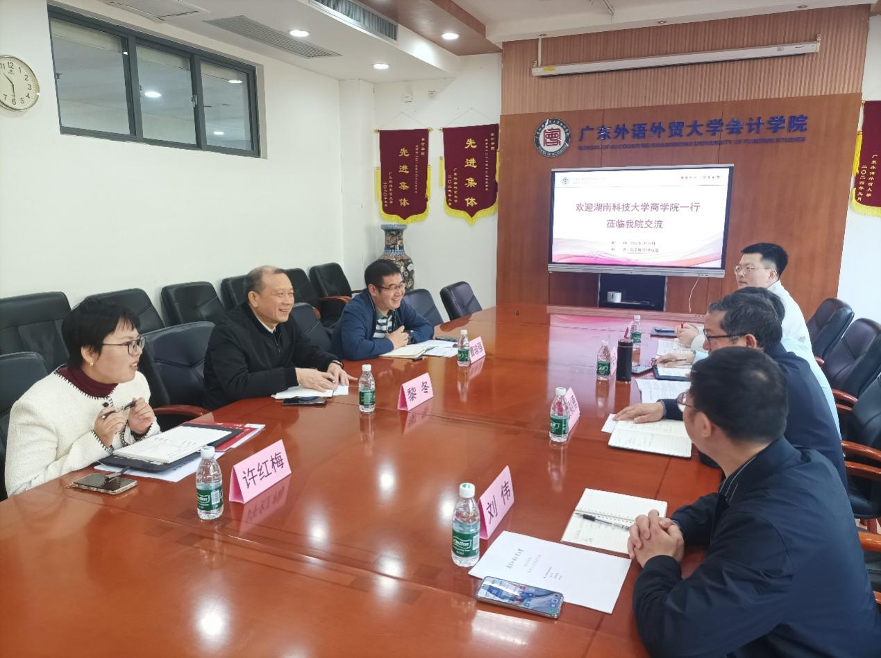 3月20日上午,湖南科技大学商学院会计学科负责人颜剩勇教授、会计系主任符安平、会计研究所所长刘伟、会计系副主任廖志超等一行到访beat365。beat365党委书记黎冬、会计系主任曹瑜强、财务管理系主任许红梅接待来访嘉宾,会议在院系楼101进行。黎冬书记主持此次会议。