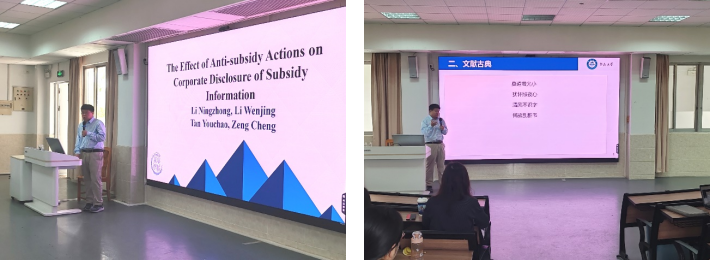 谭教授以清代徐骏的《清风涛》一诗生动地引出了此次讲座的主题——反补贴行为对企业补贴信息披露的影响。首先,谭教授介绍了政府补贴的三种类型以及WTO所禁止的补贴类型及其三个条件,即政府或任何公共机构发放、专一性、用途与出口相关,作为文章核心解释变量的衡量依据。紧接着,谭教授提出论文的主要研究问题:即使信息披露能够通过增强透明度降低融资成本,其中政府补贴信息又能够向外界传递企业和政府关系的积极信号,然而这些信息同时也可能被国外反补贴组织所利用,在管理者不确定披露所带来的后果时,公司会选择保守策略从而减少信息的披露。通过实证分析和检验发现:中国上市公司在其出口产品受到另一个国家或经济区反补贴调查或反补贴处罚时,其会减少政府补贴信息的披露。异质性检验结果表明,当公司面临的反补贴税率越高、反补贴税率金额越高、发起反补贴的国家与中国的关系越差、产品出口国家数量越多时,公司进行政府补贴信息披露的意愿越低。