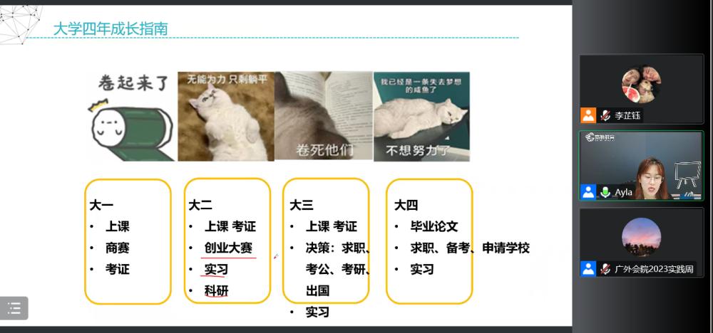 最后,关于大学生如何在大学阶段实现专业学习与自我成长问题,石明月老师总结了一份大学四年成长指南为同学们答疑解惑。指南里老师分别强调同学们应该注重除了以上讲解的专业硬实力以外,相关个人成长的软实力提升也需要注重发掘。石明月老师分别从全面领导力、全球化思维、关系拓展力、商业敏感度、专业化技能五个角度,结合同学们现实生活中遇到的如课堂Pre、摆烂内卷等情景分析,鼓励同学们要积极主动抓住大学里难得的挑战与机遇实现自我全面能力的综合提升。