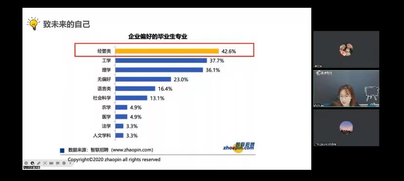 首先,石明月老师引入同学们从对自我未来行业规划出发,通过某招聘网站的有效数据分析,站在企业偏好角度带大家认识当下专业与现实行业的联系。从中给大家展示到,经管类学生的专业学习领域相比之下由于人数多,学习范围广,与现实行业应用挂钩等优势而较受企业认可欢迎。以此来减轻不少同学对于当下学习与未来就业的焦虑疑惑,同时以此展开接下来站在行业视角与同学们的探讨交流。