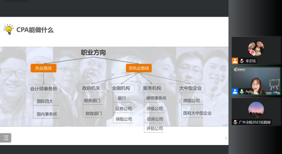 其次,在进入第二板块的“进阶指南:CPA是什么”的讲解分析中,石明月老师明确指出,有些同学将CPA、事务所与审计工作划等号的想法是错误的,老师引导大家从更加广阔的企业学习与薪资需求等方面,结合具体的数据分析让同学们理解CPA的重要性和自我提升的关键。石明月老师分析CPA证书给许多同学特别是目前还没有明确规划的同学带来的不止是一张证书的荣誉,而是一个实现自我提升与价值实现的广阔平台。