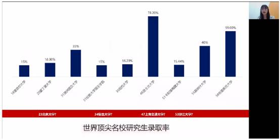 然后,主讲老师根据有留学意向同学的能力不同,为同学们的留学计划院校提出了建议。同时,老师还向同学们展示了一些世界名校研究生录取率以及录取标准,指出留学形势的严峻程度并鼓励同学们提早准备,提高自身的软实力。