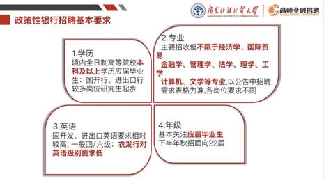 由于每个银行侧重点不一,存在一定的差别,需要同学们提前了解,从而获得更适合自己的方向。比如三个政策性银行:国家开发银行、中国农业发展银行、中国进出口银行。国家开发银行是2015年3月,国务院明确国开行定位为开发性金融机构。国开行主要通过开展中长期信贷与投资等金融业务,为国民经济重大中长期发展战略服务。而中国农业发展银行是按照国家的法律法规和方针政策,以国家信用为基础筹集资金,承担农业政策性金融业务,代理财政支农资金的拨付,为农业和农村经济发展服务。最后中国进出口银行支持中国对外经济贸易投资发展与国际经济合作,加大对重点领域和薄弱环节的支持力度,创造公平、透明、稳定的对外贸易环境。由于不同银行的定位不同,对报考的同学的要求也会有一定的差异,所以需要我们在此方面做一定的考虑。