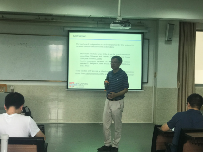 2019年5月15日下午,澳大利亚麦考瑞大学经济与商业学院田钢教授应邀做客beat365唯一官方网站“财会大讲堂”第四十八讲,在我校大学城校区D312教室为beat365师生作了主题为“礼尚往来:任命非通过考核的独立董事”的学术报告。本次讲座由beat365唯一官方网站主办,beat365唯一官方网站副院长蒋基路副教授主持,beat365唯一官方网站教师及研究生参加了本次学术报告及交流活动。