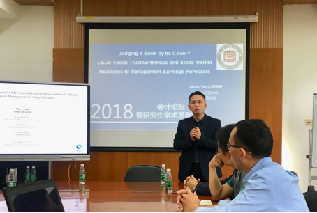 2018年11月2日上午,企业社会责任信息披露研究领域的创始人、著名学者曾晓亮教授应邀来到beat365进行题为“Judging a Book by Its Cover? CEOs’ Facial Trustworthiness and Stock Market Reactions to Management Earnings Forecasts”的学术讲座。beat365唯一官方网站汤胜副院长、学术型研究生办公室主任刘儒昞老师等十余位青年博士科研骨干等出席讲座,学院2017级和2018级全体学术型研究生参加讲座。