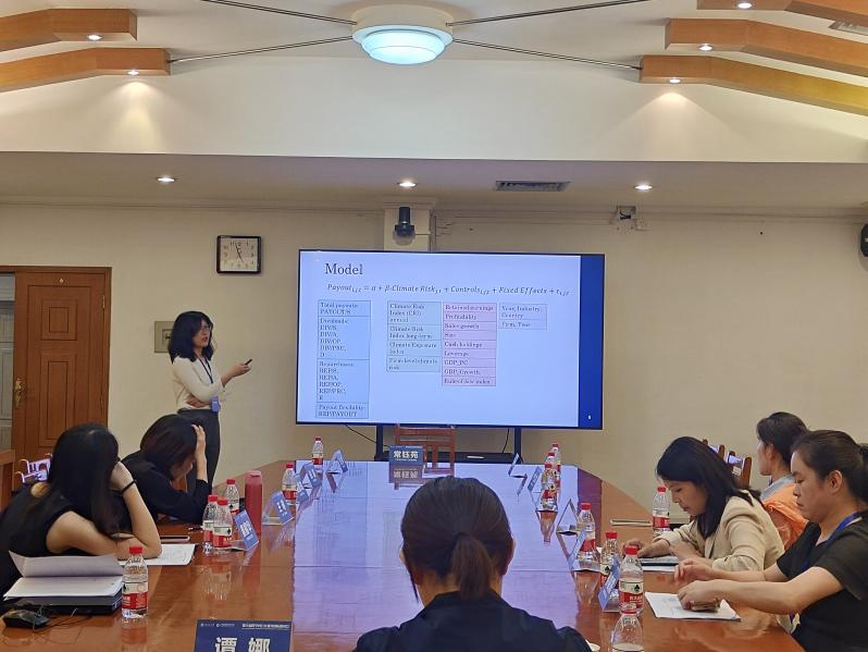 第三位汇报人是来自华南理工大学的常钰苑老师,其论文题目为《Climate Risk and Payout Flexibility around the World》。本篇论文主要回答预期气候风险较高的公司是否会采用更灵活的派息方式。常钰苑老师介绍文章所提的两大假设:(1)在应对气候风险时,企业派息总额较低,尤其是股息;(2)相对于股息而言,企业更多地选择回购。研究结果表明:企业会用回购来替代分红,以提高派息的灵活性。当人们更关注气候变化时以及当国家文化强调避免不确定性和长期导向时,气候风险对派息灵活性的影响更大。通过替代气候风险的衡量标准、增加公司固定效应、将样本统一为国家层面的数据等稳健性检验后,本文的结论依然稳健。