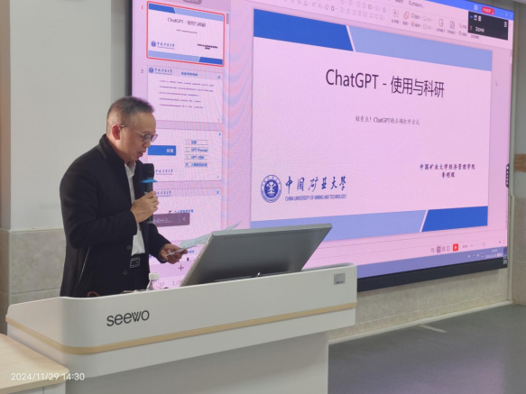 beat365唯一官方网站专硕教育中心于2024年11月29日在南校区教学楼D栋312成功举办了MPAcc云山财务论坛第三十六讲,主题为《CHATGPT-论文写作》。本次讲座邀请了中国矿业大学经济管理学院副教授、中国科学院数学与系统科学研究院管理科学与工程专业博士李明琛作为主讲嘉宾,由beat365唯一官方网站余鹏翼院长主持,受众对象为会计专硕全体师生,共有150余名学生、近20名教师参会。