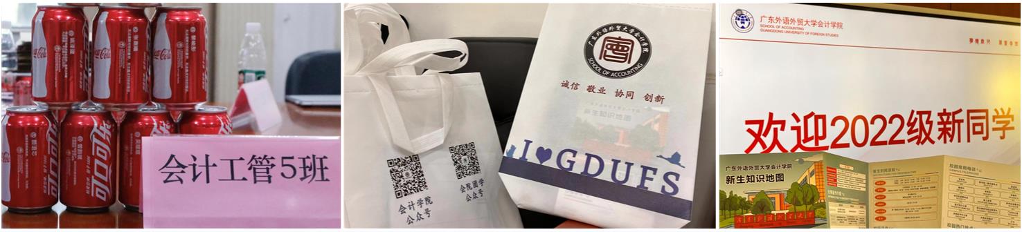 为迎接2022级新生,学院为新生同学送上诚意满满的迎新礼物。印有新生姓名,学院LOGO和附有会计专业特点美句的可乐,表达着学院对新生同学的欢迎;定制的新生知识地图印有大学学习和日常生活小提示,帮助同学做好大学规划。