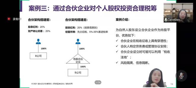 她还通过案件介绍、股转构图的前后对比及合伙架构搭建前后对比方式分享了四个税务案例。在商业竞争对手举报引发税务稽查、境外股权间接转让、通过合伙企业对个人股权投资合理税筹及大型省属企业的重整四个不同案例背景下,甘小月解释了税收在不同方面,以不同方式影响企业的程度。她介绍了自然人股东设立合伙企业作为持股平台的优势、采用债转股和股权划转的方式解决企业面临资不抵债的问题等,让同学能够结合专业理论知识,对税收、税务有了更深层次的理解。