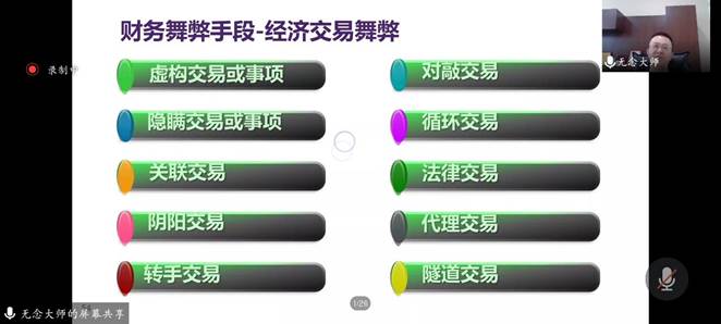 姚斌星以时间为线,以商业背景、商业模式、异常数据分析等方面,分析了瑞幸咖啡财务造假案例,獐子岛公司扇贝案例,雅百特公司的重组上市造假案例和康得新虚构销售业务的造假案例等财务舞弊典型案例的财务造假手段和过程。介绍了财务舞弊的主要手段,详细说明了财务舞弊的原理和具体操作过程,如:资本运营舞弊、虚构交易等,通过许多通俗易懂的例子帮助师生更好地理解财务舞弊的原理及其操作过程,同时结合真实的市场案例分析,详细分析了财务舞弊的典型手法,以及识别财务舞弊的突破点。还介绍了财务舞弊三角理论,黄金侦查法则,财务分析视角等财务舞弊的识别方法,以及通过上述方法如何分析识别财务舞弊、如何根据财务分析框架有效获取数据、如何进行自我合理化要素分析。他提出,审计人员不参与造假是基本的素养,要把风险控制放在第一位,只有风险控制好了才能谈价值创造。