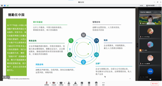 刘芳以“创新推动数字化变革”为主题,从“德勤简介”、“变中求变”、“身体力行”、“赋能助力”四个方面展开讲座。刘芳介绍了德勤会计师事务所的发展历史以及其在数字化方面的进行的创新与变革,强调了德勤在疫情期间积极利用视频网络学习推动数字化转型,做到变中求变。还介绍了德勤所使用的核心技术——人工智能、大数据、物联网、区块链、云计算&储存和AR&VR;提出”德勤勤跃“这一概念,介绍了德勤在数字化产品方面的创新。让同学们感受到数字化对企业运营、推动创新的深刻影响。