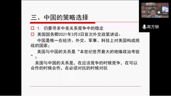 6月10日,周方银教授以“百年党史话发展——学百年党史,观世界形势,强责任担当”为主题,讲述了中国共产党百年辉煌历史,同时他结合新冠肺炎疫情防控情况,从当前国际形势、中美关系态势、中国的策略选择层面,讲述了中国在疫情防控中展现出的负责任大国的作为和担当。