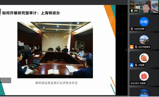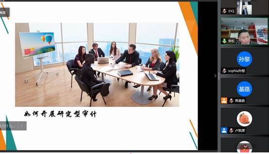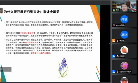 紧接着娄权老师进一步从 1)审计全覆盖的要求;2)全国十四五规划; 3) 全国审计会议;4)实务领域审计发展趋势这四个方面来详细阐述了开展研究型审计的背景,主要原因和其现实意义。深入开展研究型审计是实现新时代审计事业高质量发展的必由之路。